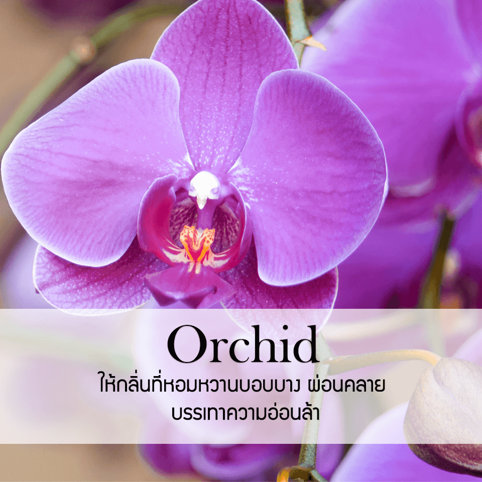 กลื่นหอมหวานบอบบางของกล้วยไม้ เป็นกลิ่นพิเศษสุด ช่วยเสริมสร้างอารมณ์ที่ผ่อนคลาย และยังช่วยลดความเครียด และอ่อนล้าทางจิตใจ